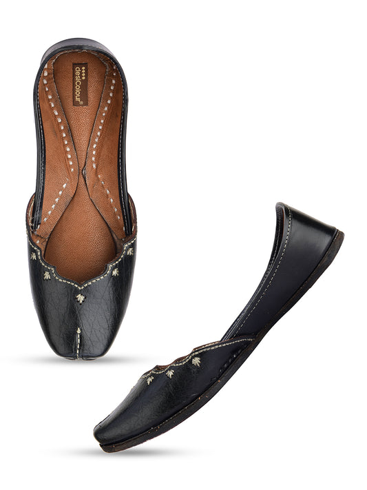 Women Gold-Toned Embellished Leather Ethnic Mojaris Flats