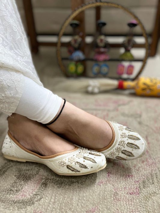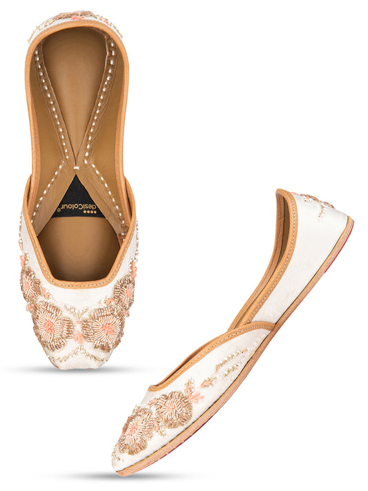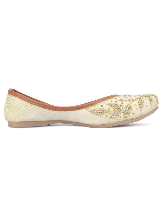 Women Gold-Toned Embellished Leather Ethnic Mojaris Flats