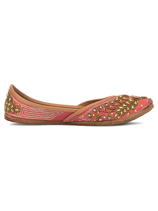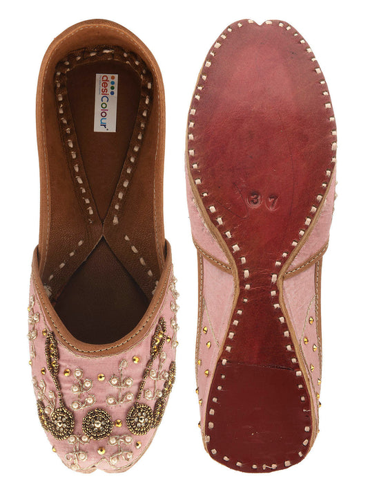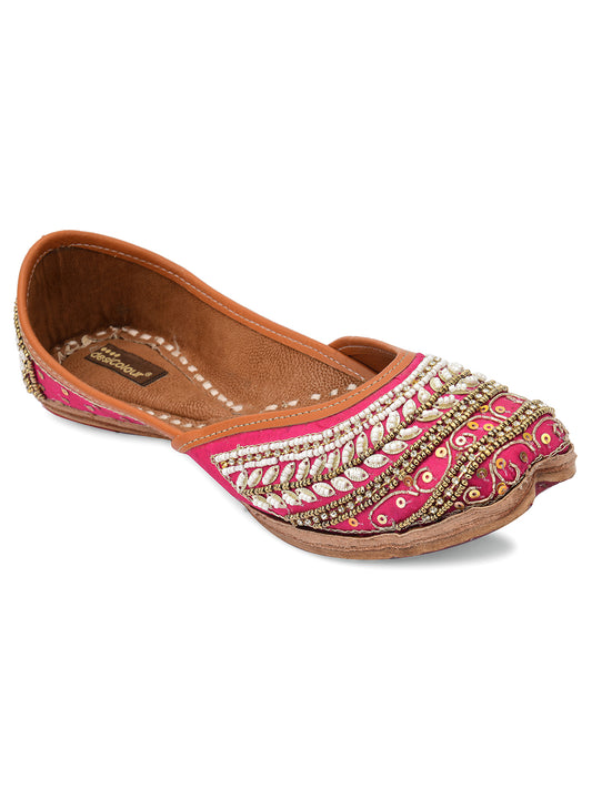 Women Pink Embellished Leather Ethnic Mojaris Flats
