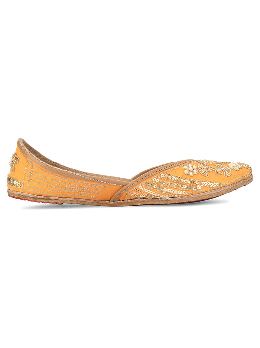 Women Mustard Embellished Leather Ethnic Mojaris Flats
