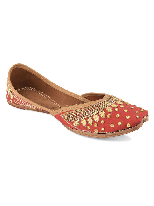 Women Red Embellished Leather Ethnic Mojaris Flats