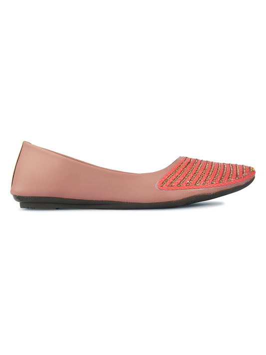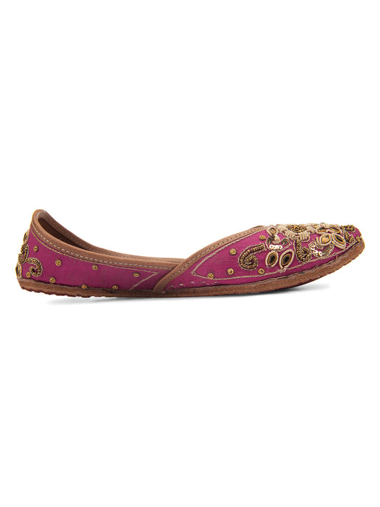 Women Pink Embellished Leather Ethnic Mojaris Flats