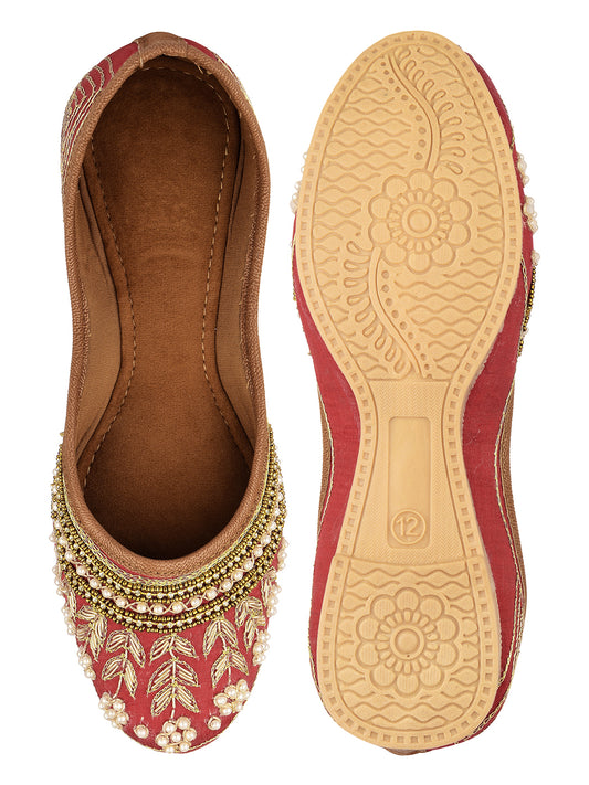 Women Maroon Embellished Leather Ethnic Mojaris Flats