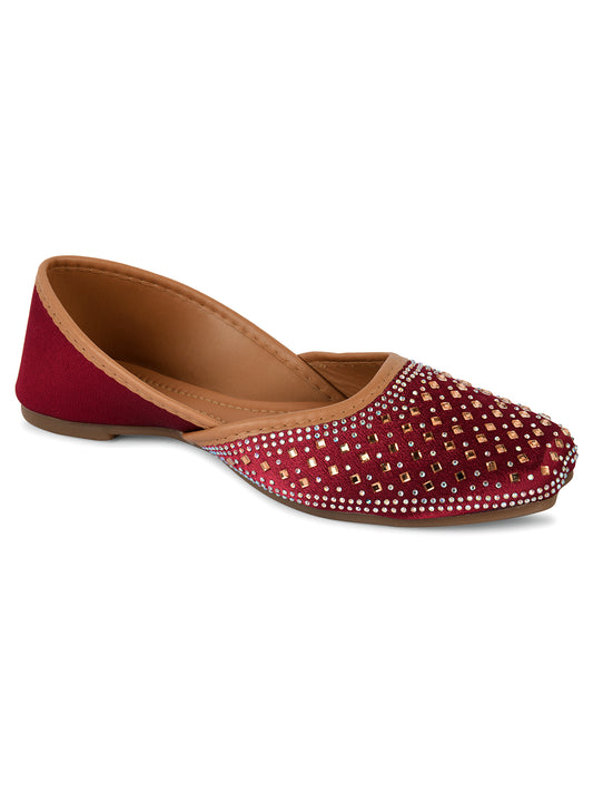 Women Red Embellished Mojaris with Laser Cuts Flats