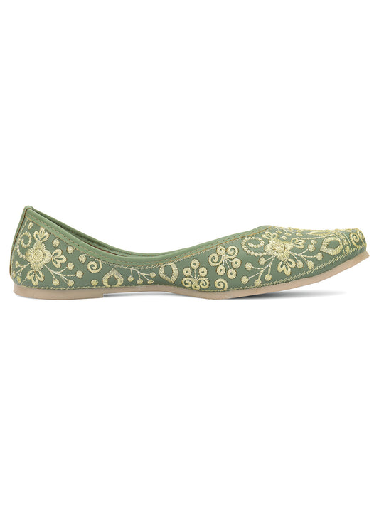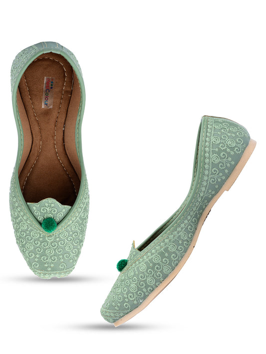 Women Green Embellished Leather Ethnic Mojaris Flats