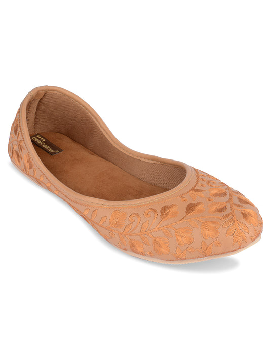 Women Pink Gold-Toned Woven Design Velvet Mojaris