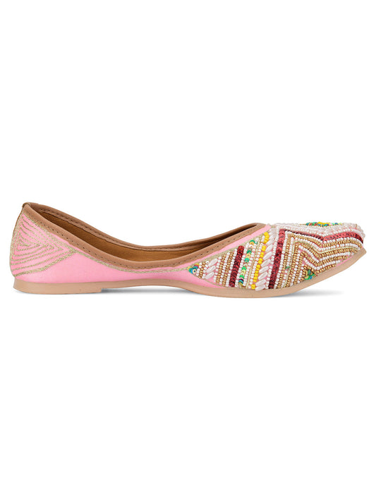 Women Pink Embellished Leather Ethnic Mojaris Flats