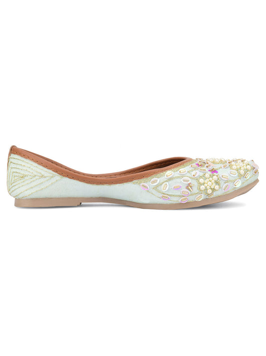 Women Sea Green Embellished Ethnic Mojaris Flats