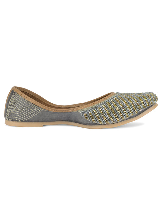 Women Grey Embellished Leather Ethnic Mojaris Flats