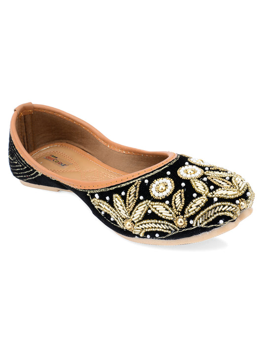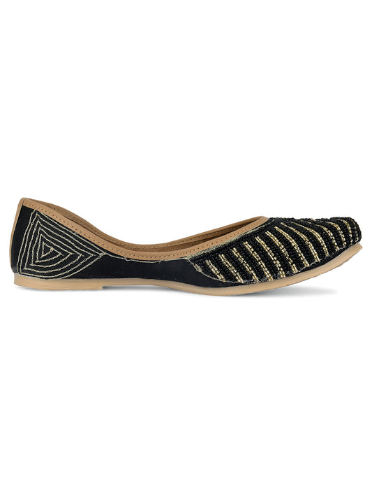 Women Black Embellished Leather Ethnic Mojaris Flats