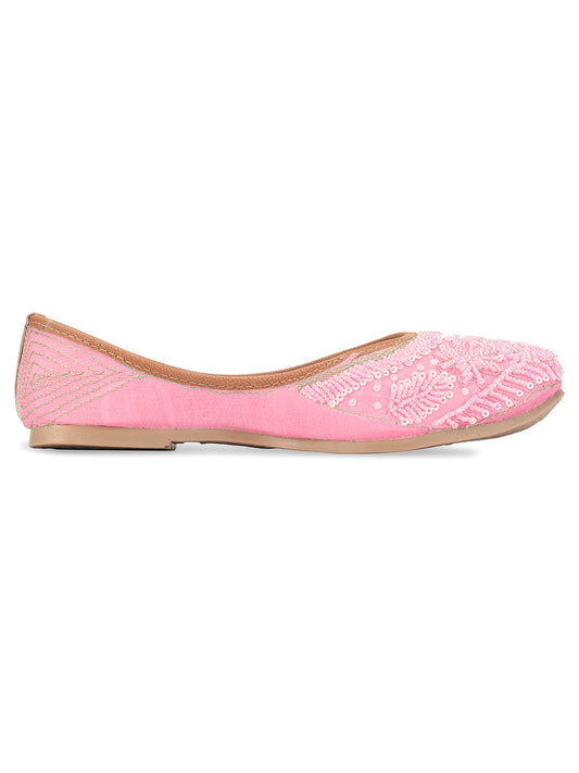 Women Pink Embellished Leather Ethnic Mojaris Flats