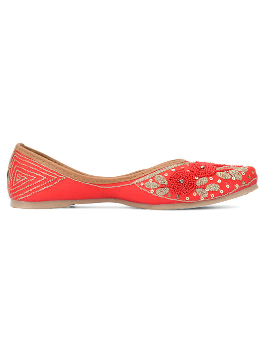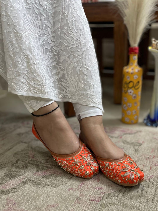 Women Orange Embellished Leather Ethnic Mojaris Flats
