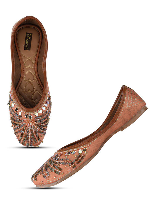 Women Peach-Coloured Embellished Leather Ethnic Mojaris Flats