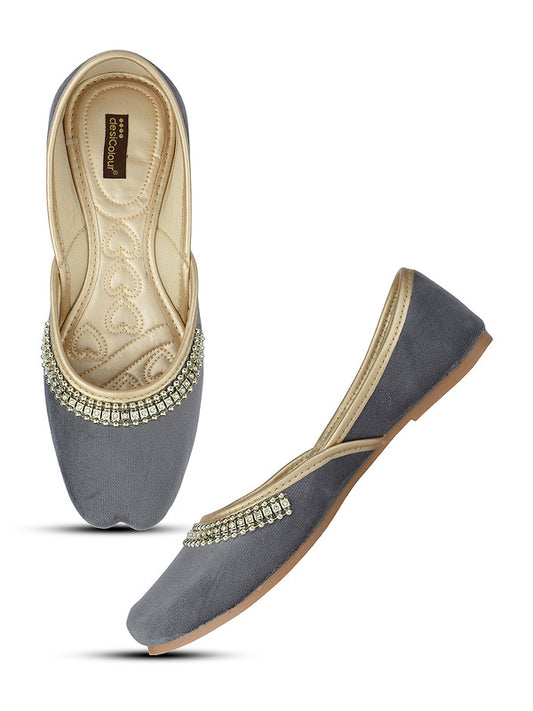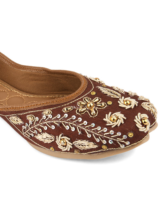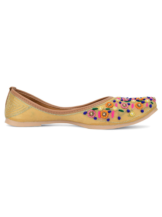 Women Gold-Toned Embellished Leather Ethnic Mojaris Flats