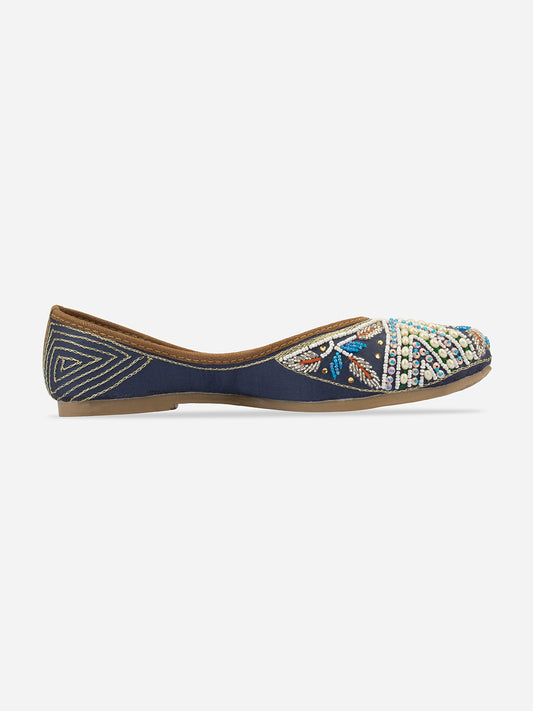 Women Blue Embellished Leather Ethnic Mojaris Flats