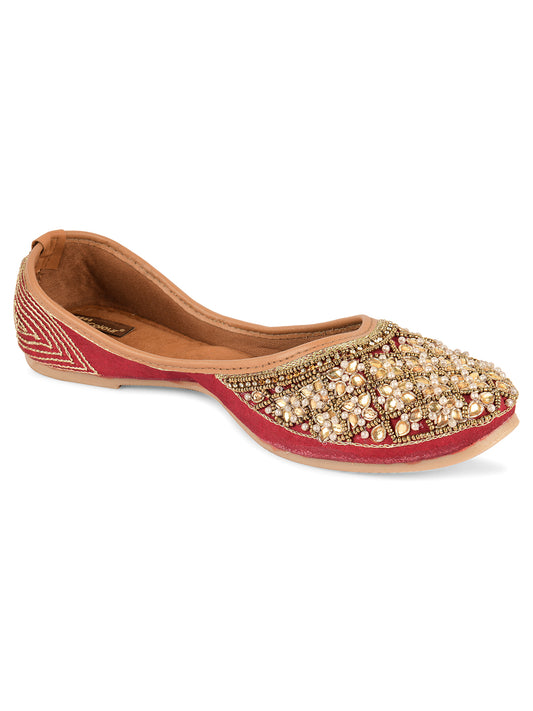 Women Red Embellished Leather Ethnic Mojaris Flats