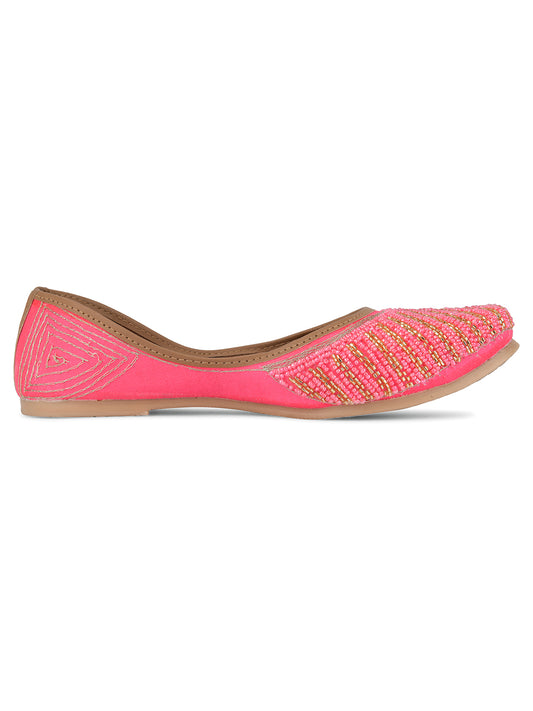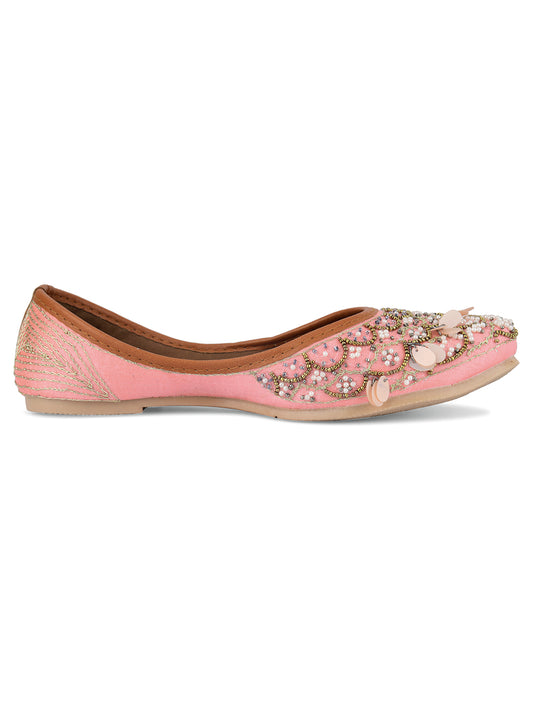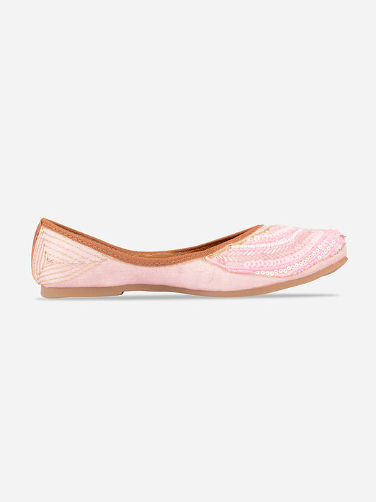 Women Pink Embellished Leather Ethnic Mojaris Flats
