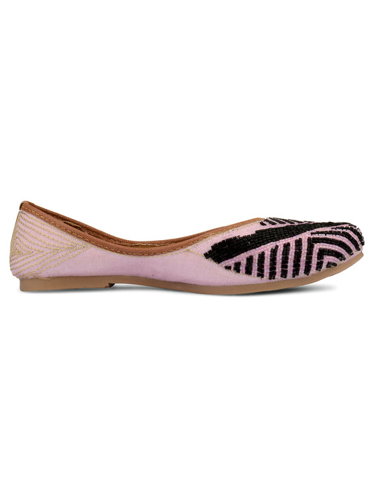 Women Pink Printed Leather Ethnic Mojaris with Laser Cuts Flats