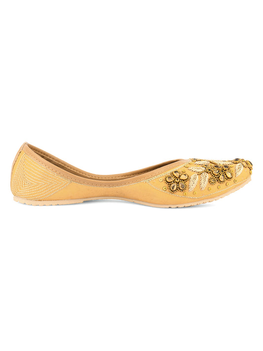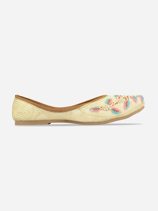 Women Gold-Toned Beige Embellished Leather Mojaris