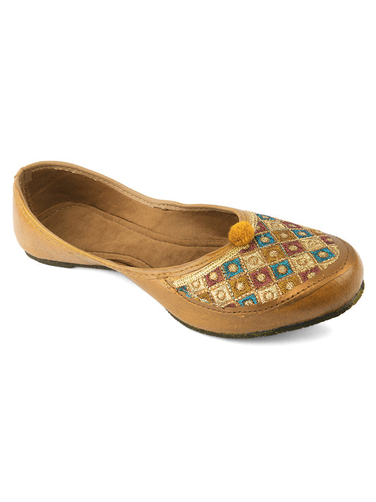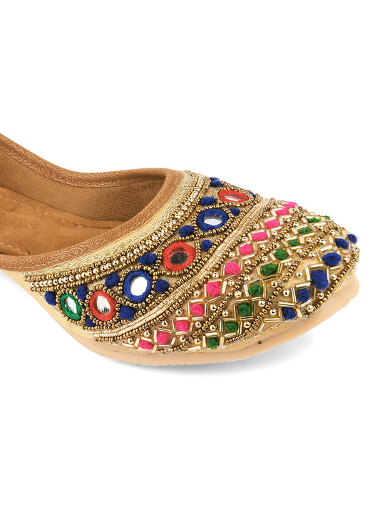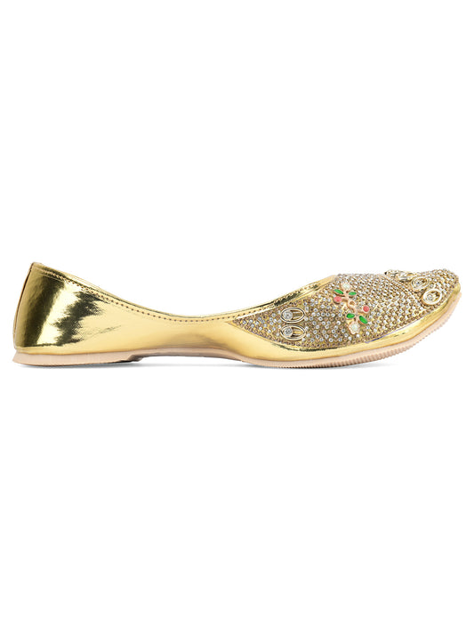 Women Gold-Toned Embellished Leather Ethnic Mojaris Flats