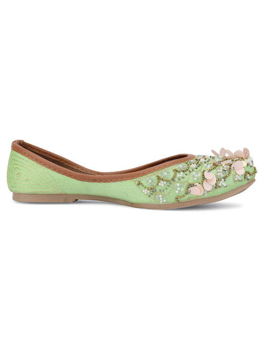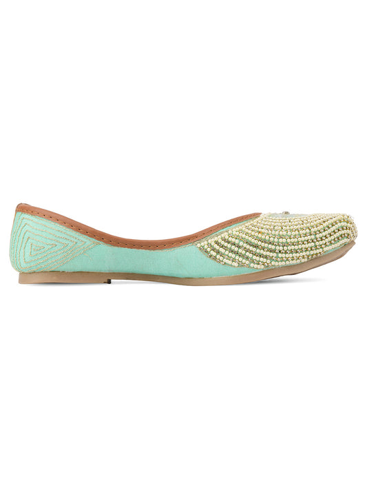 Women Sea Green Embellished Ethnic Mojaris Flats