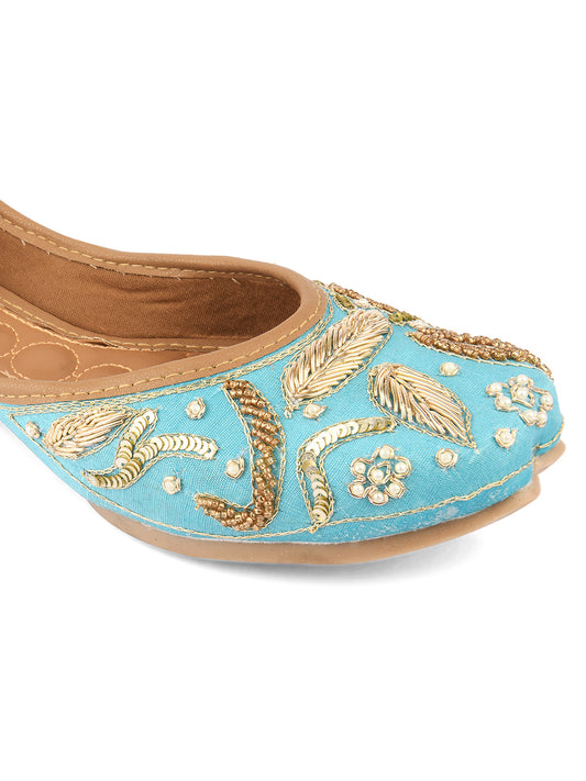 Women Blue Embellished Leather Ethnic Mojari Flats
