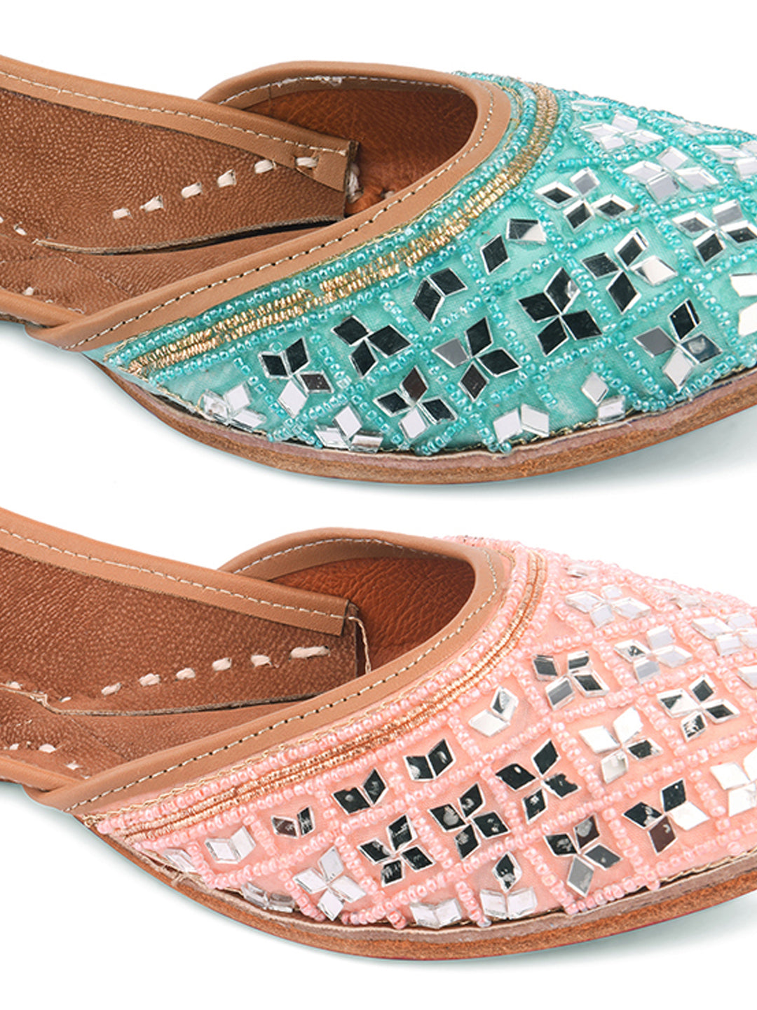 Women Blue PInk Embellished Leather Ethnic Mojaris