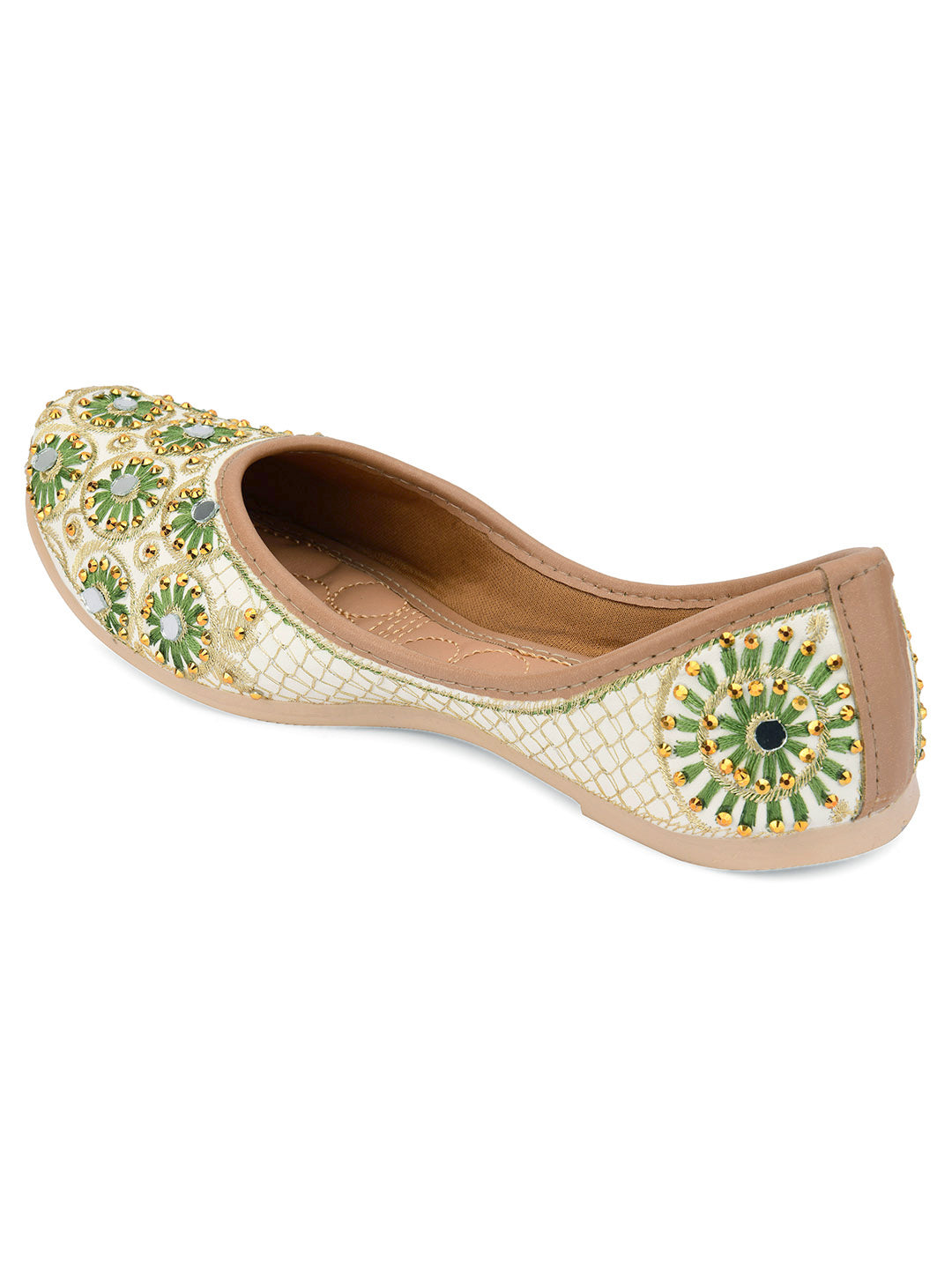 Women Green Mirror Work Embellished Ethnic Mojaris Flats